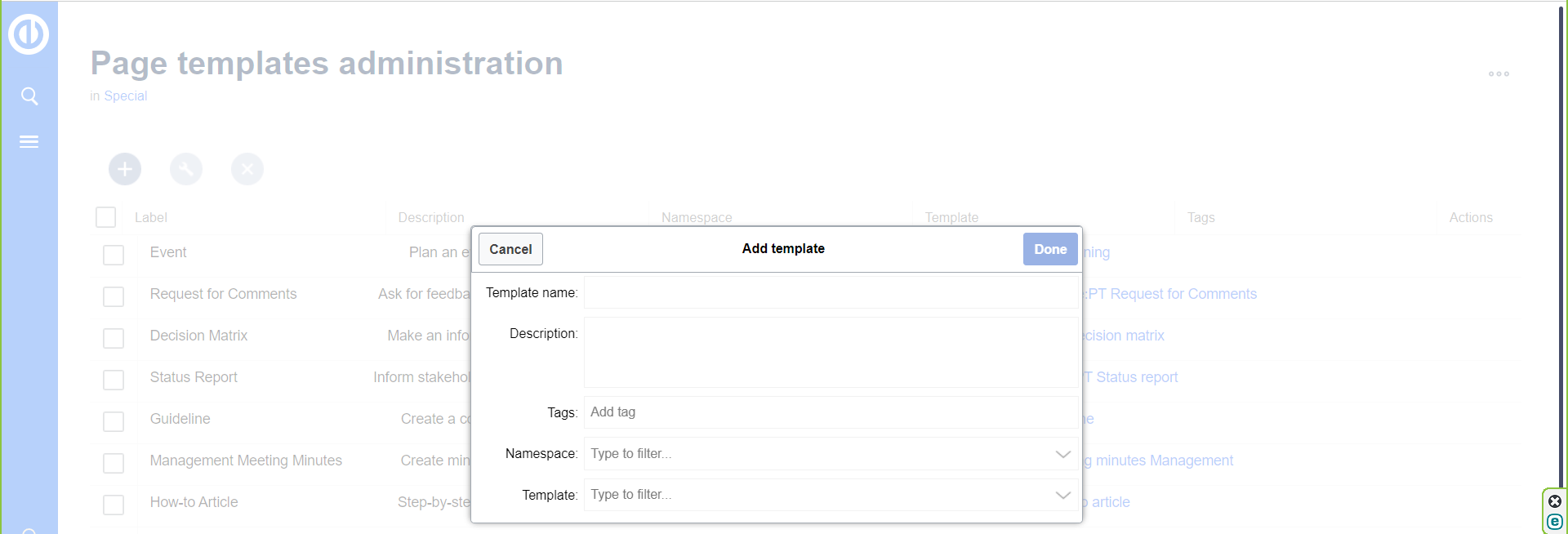 Creating and Using Page Templates: Any knowledge base user with edit rights can add a new page template in the template namespace. Admin permissions are required to add the template to Page template administration. Each page template depends on an actual page in the Template namespace.
