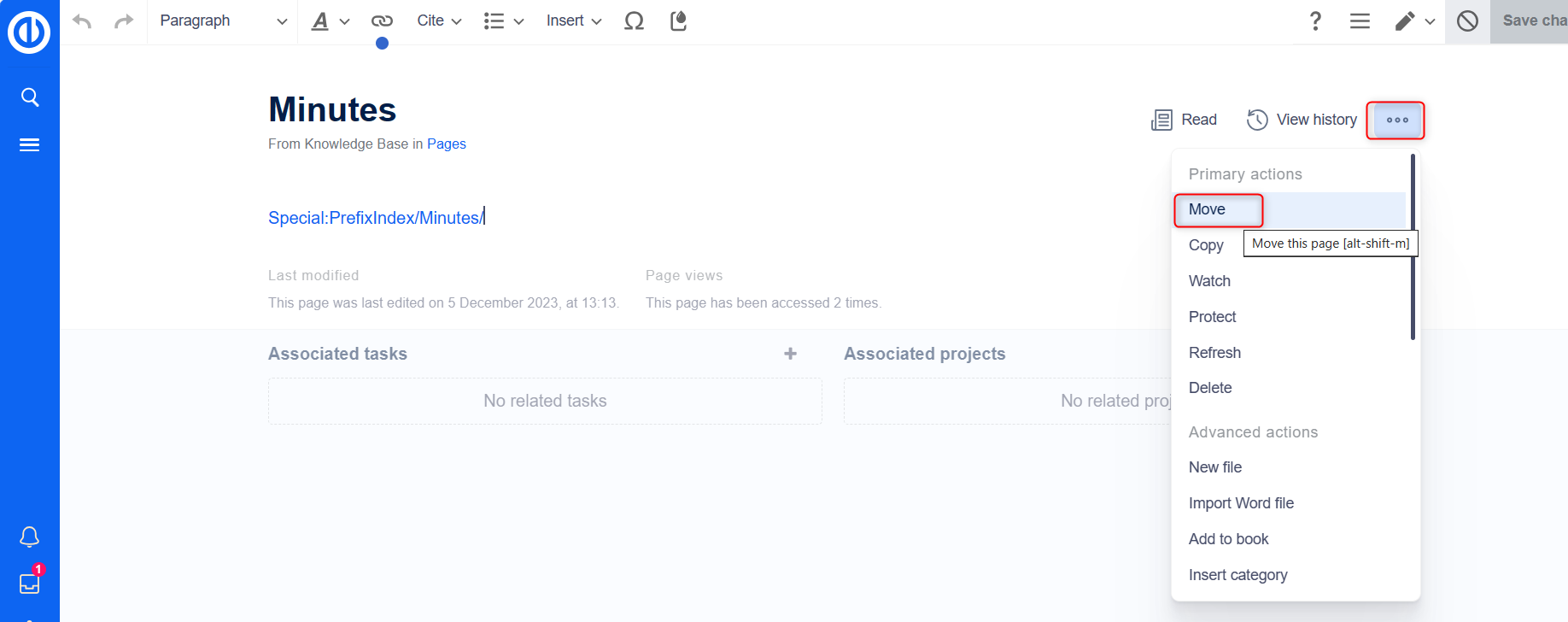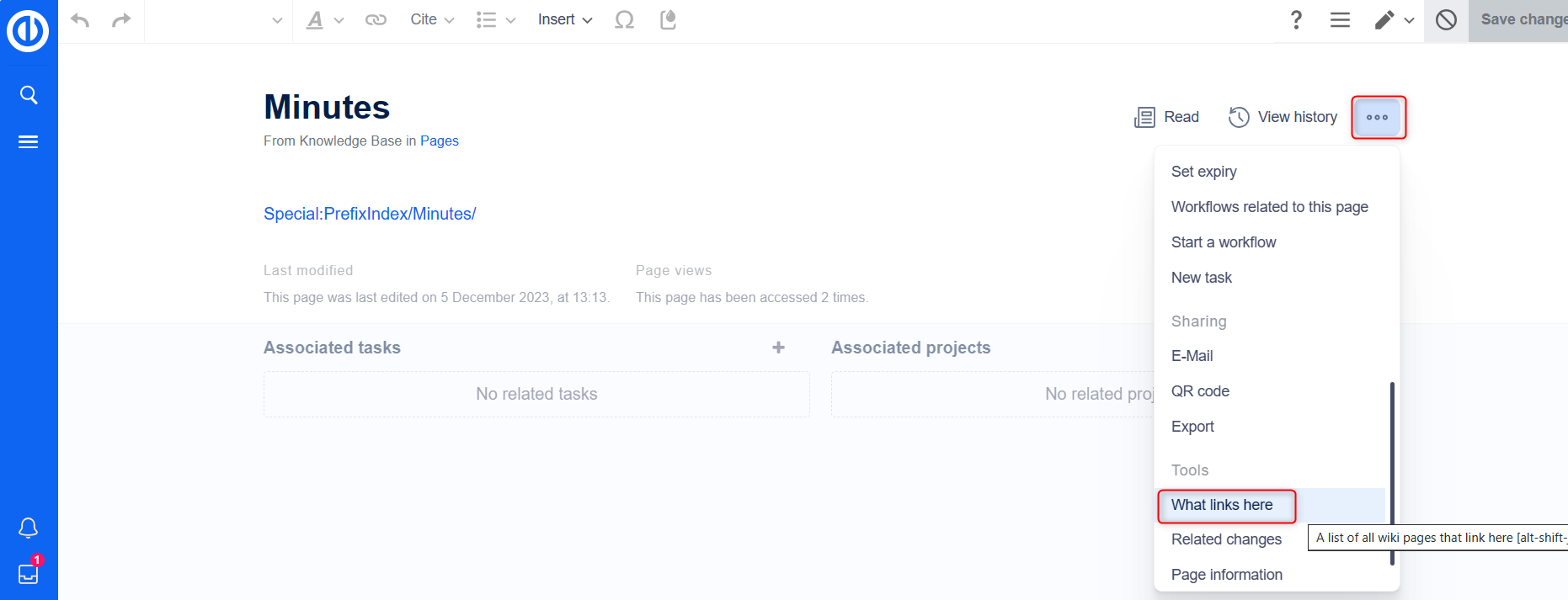Before moving a page, it's important to check if other pages link to that page name. To do this, navigate to "What links here" under "All actions" in the page tools. If there are many links listed here, it's advisable to create a redirect when moving the page.