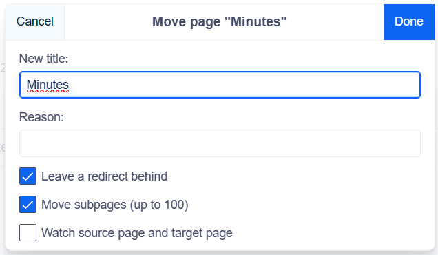 - Optionally provide a reason for the page move, which will be recorded in the logs.