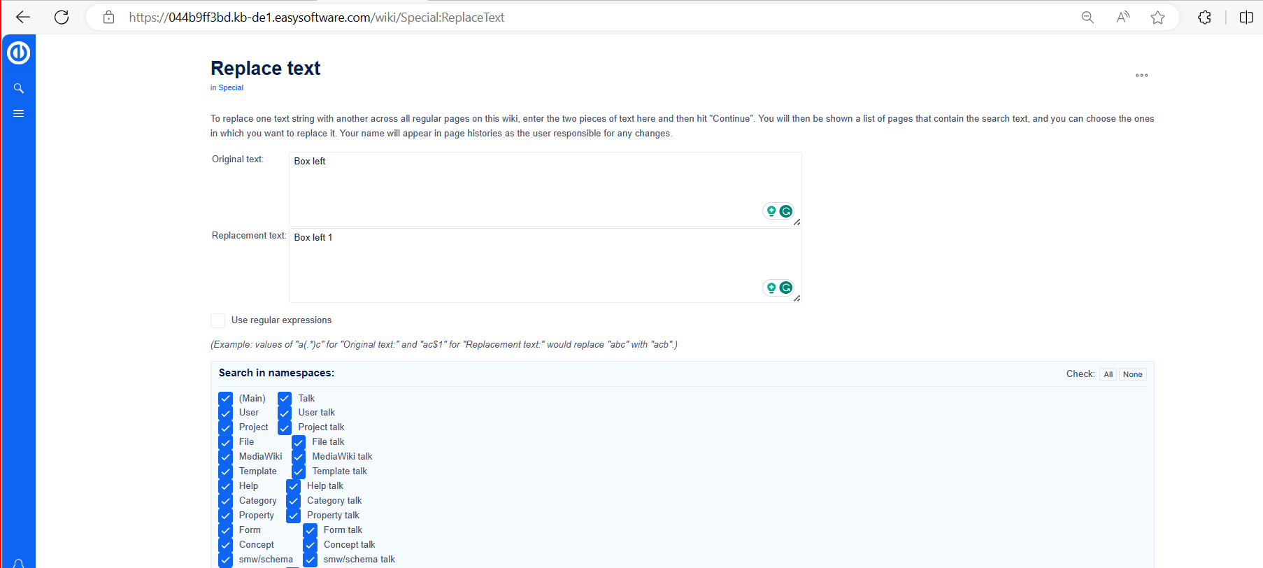 A namespace defines an area in your knowledge base, identifiable by the namespace prefix in the page title: