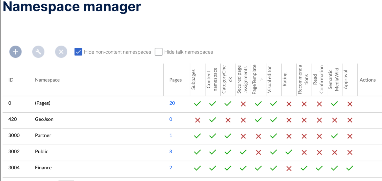 This interface allows the configuration of individual namespaces and their permitted features. New namespaces can be added or existing ones deleted. The "hide non-content" option, when checked, conceals system namespaces, displaying only content namespaces suitable for the article population.