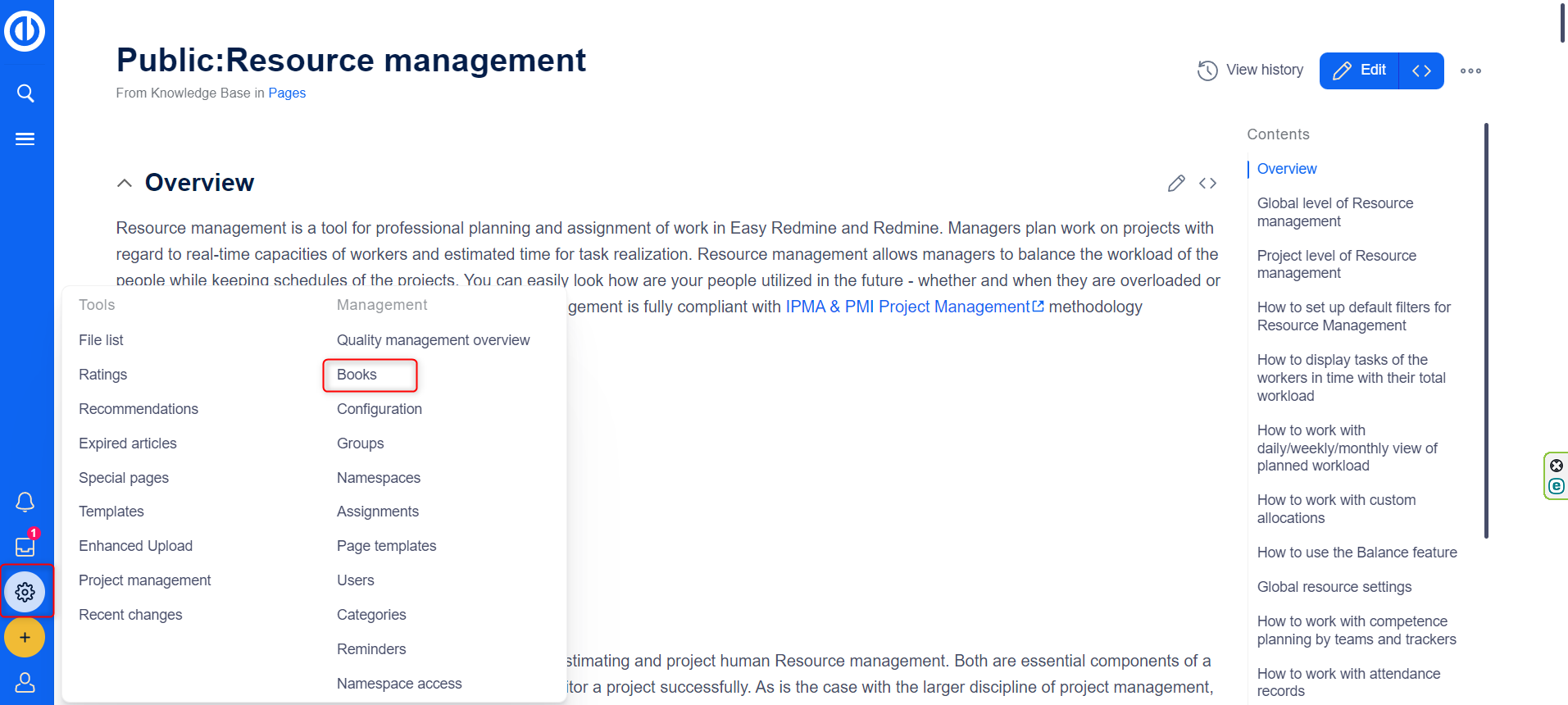 Usage: The Books feature enables the creation of extensive manuals, guides, documentation, or similar content by assembling existing pages into a cohesive book.