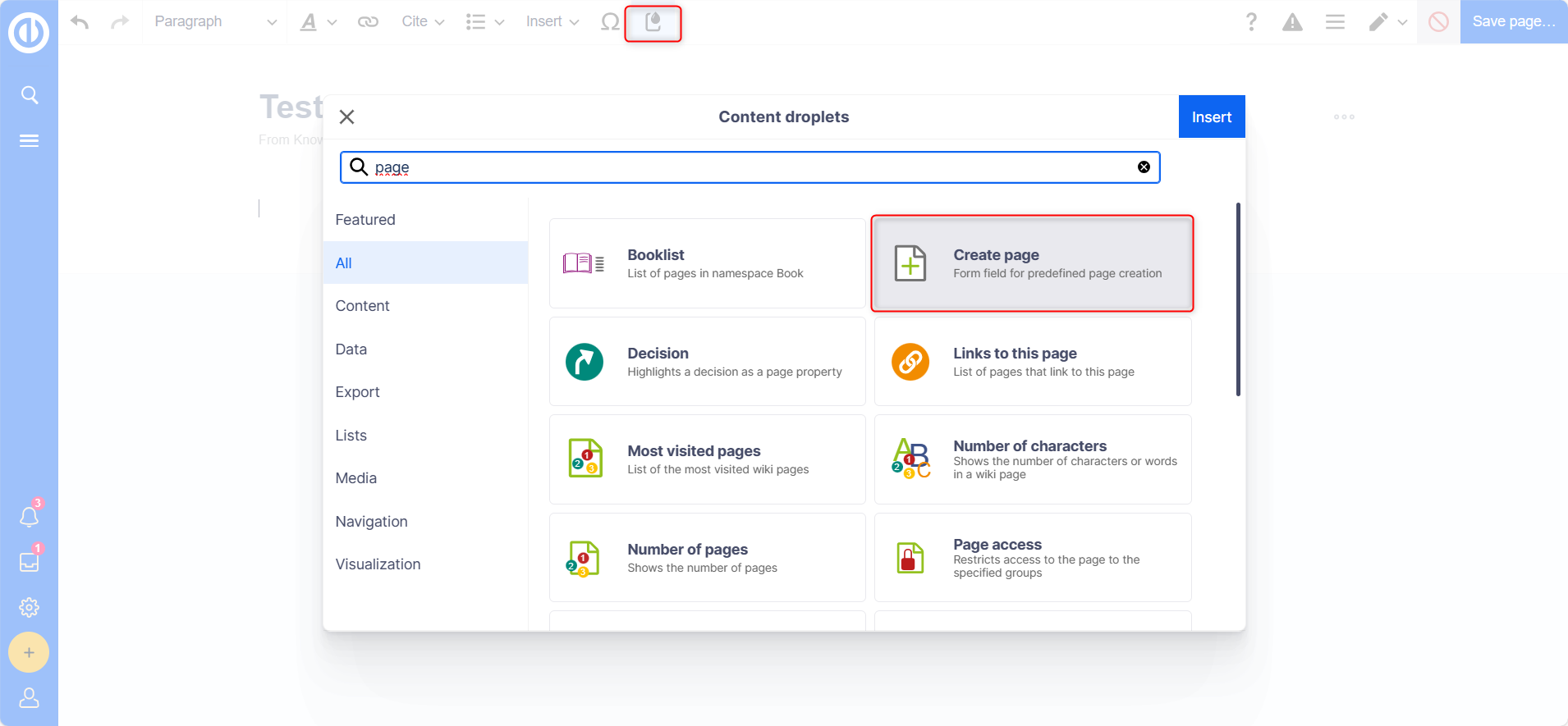 Binding a Template to a Button: Utilize a Create Page droplet to associate a template with a button. Upon clicking the button, users will be redirected to a new knowledge article page pre-populated with the template data. Strategically place the button on an overview page or any other easily visible location for the user.