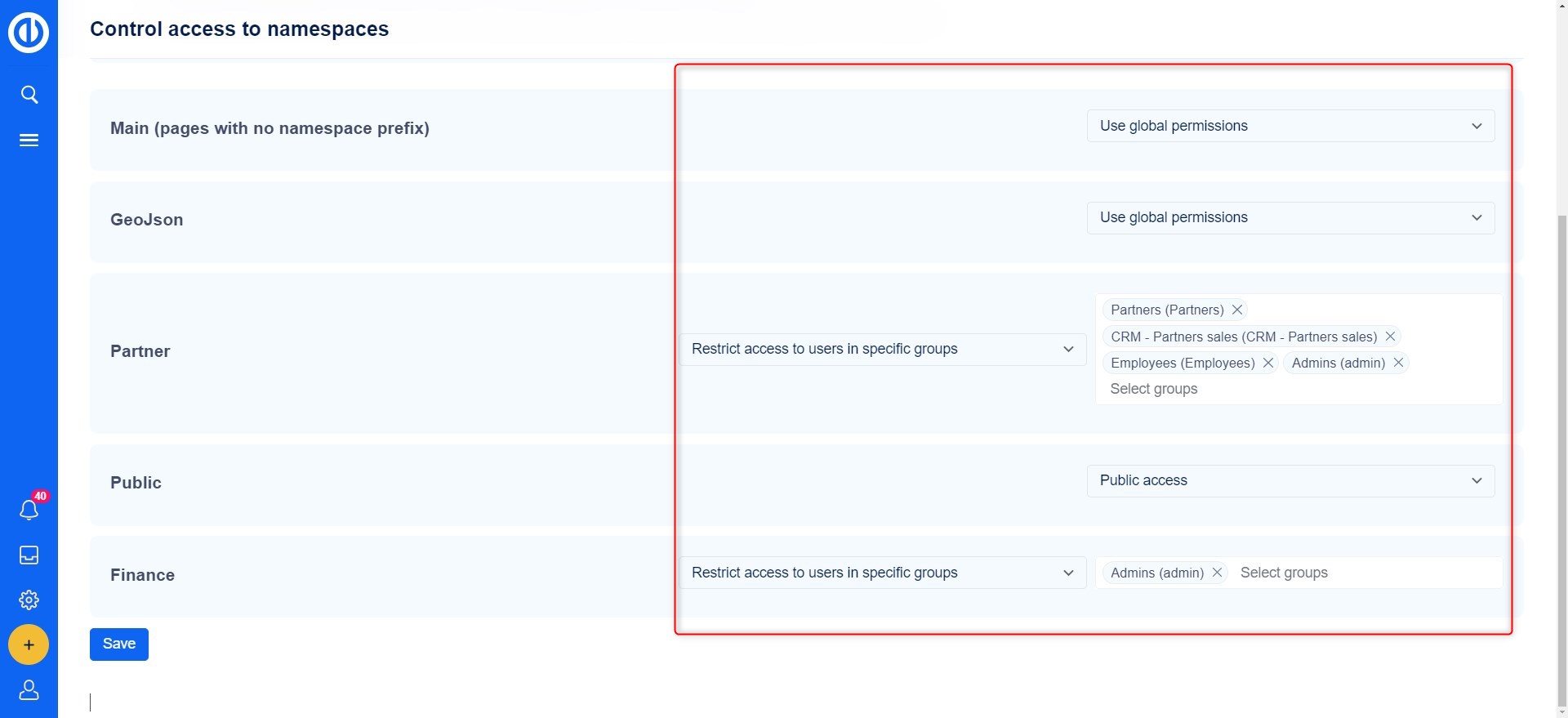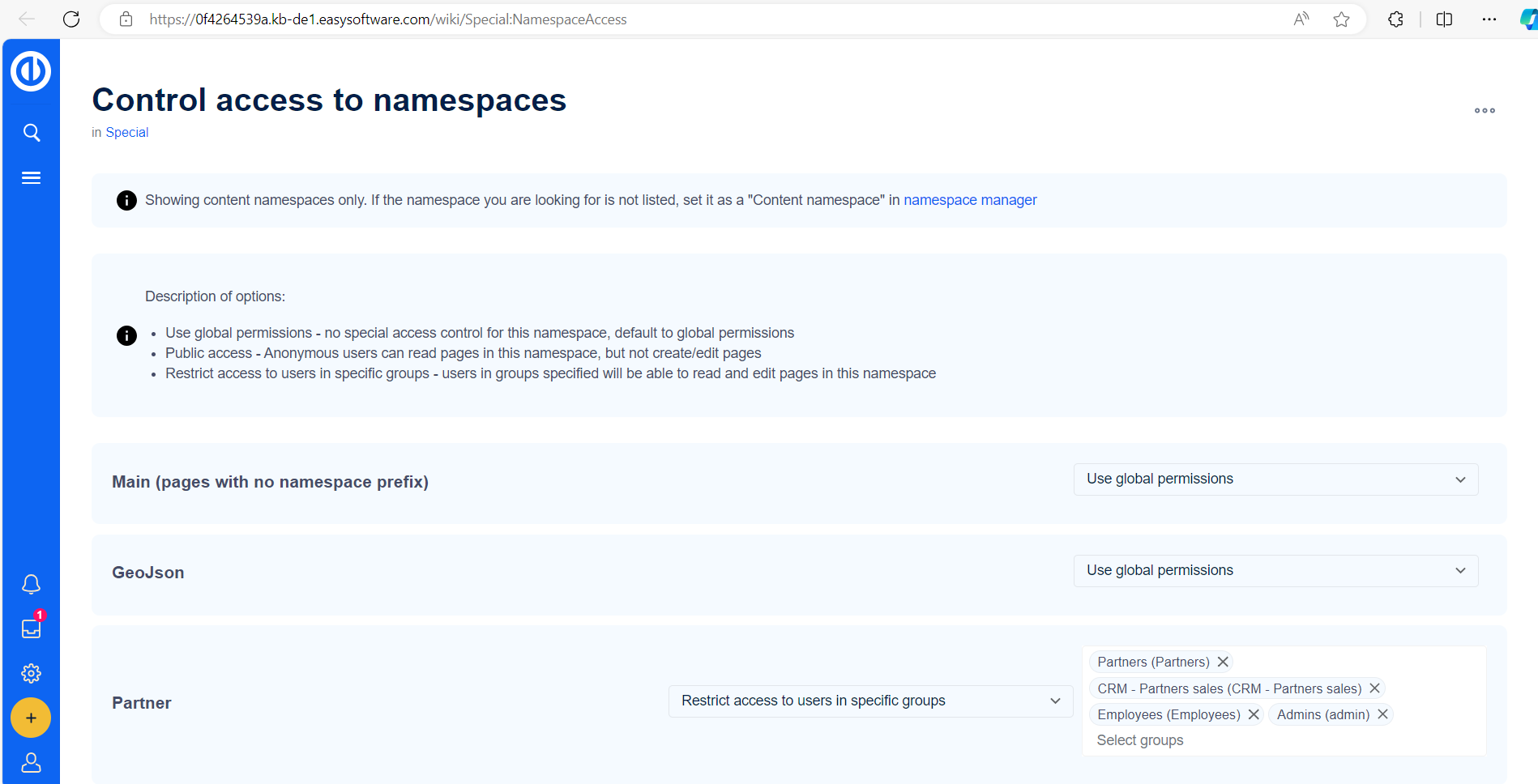Administrators can restrict specific Namespaces in the Knowledge base for specific user Groups (that come from Easy8) in Namespace Access ( Global actions >>Namespace Access (under administration))