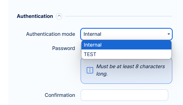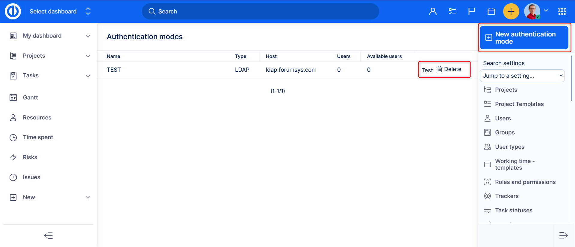 Go to Administration >> LDAP authentication. Here you find the list of all existing LDAP authentication modes including the options to test or delete any. To create a new one, click on the "New authentication mode" button in the top right corner.