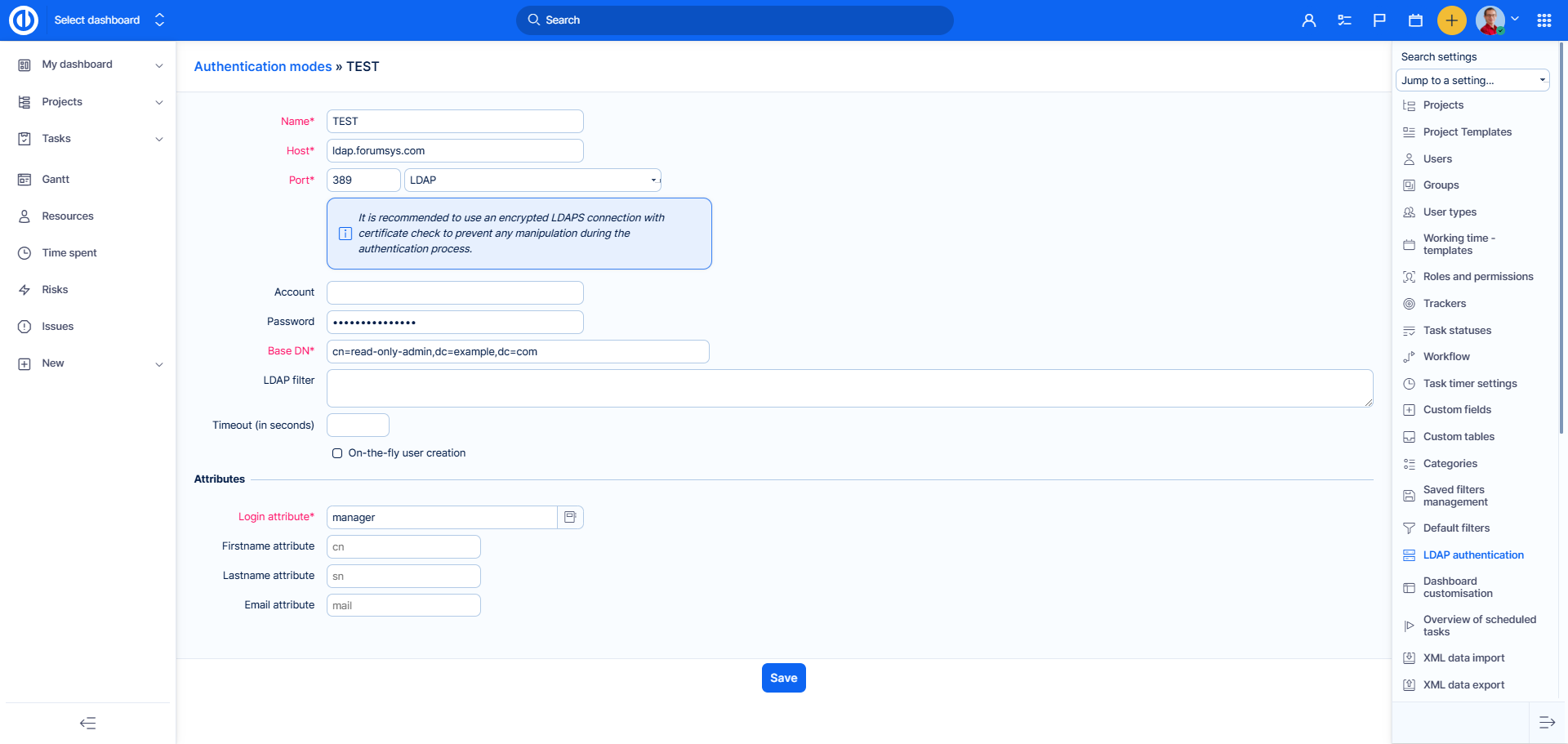 - For connection issues, you can use the "Test" button on the LDAP server listing. Beware, this only serves to test whether you can connect to LDAP. The common problem is that administrators do not fill the LDAP system user even when LDAP settings are still protected. In this case, the test will run OK because the connection works but no users can be added because the LDAP does not "see" any.