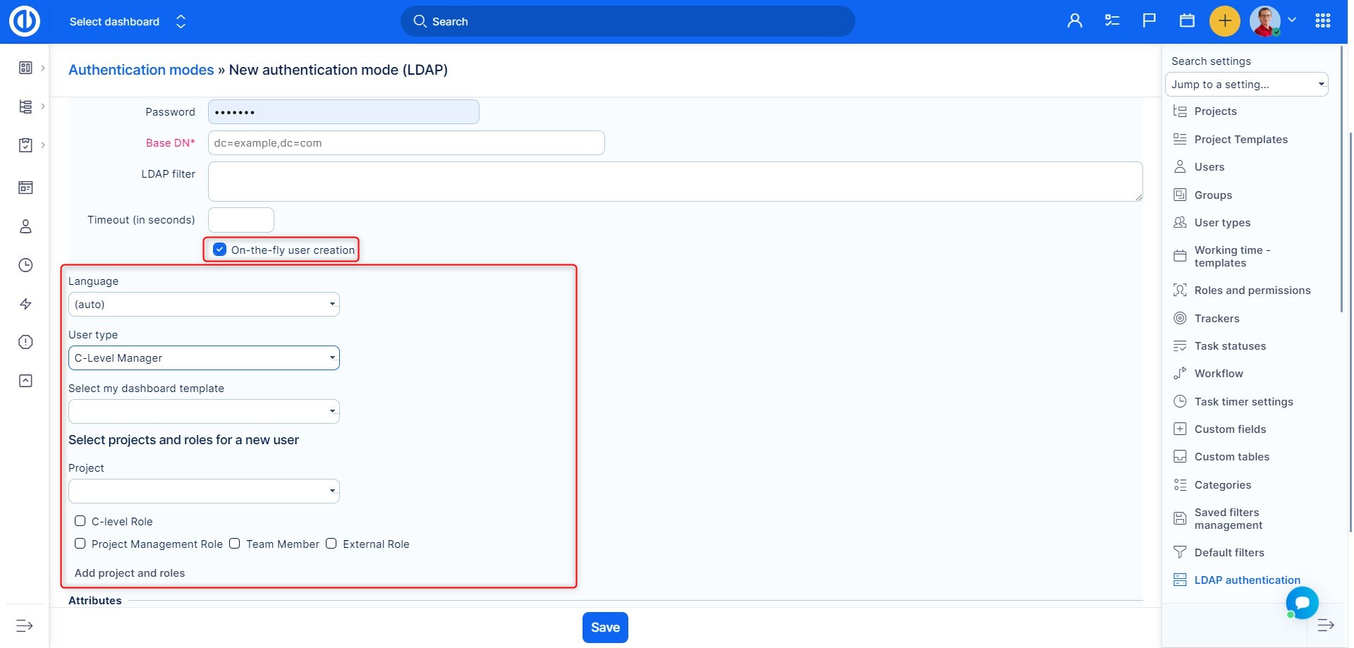 After checking the field, options will appear. Where you can set up which roles, dashboards etc the newly created user will have, what should be the default language and which projects they should be assigned to.