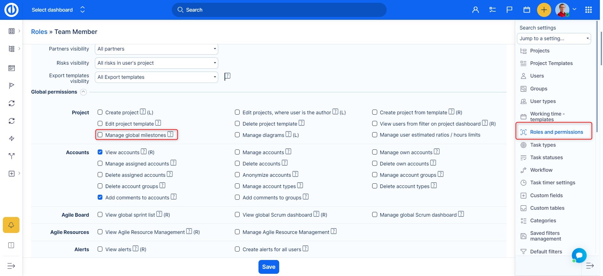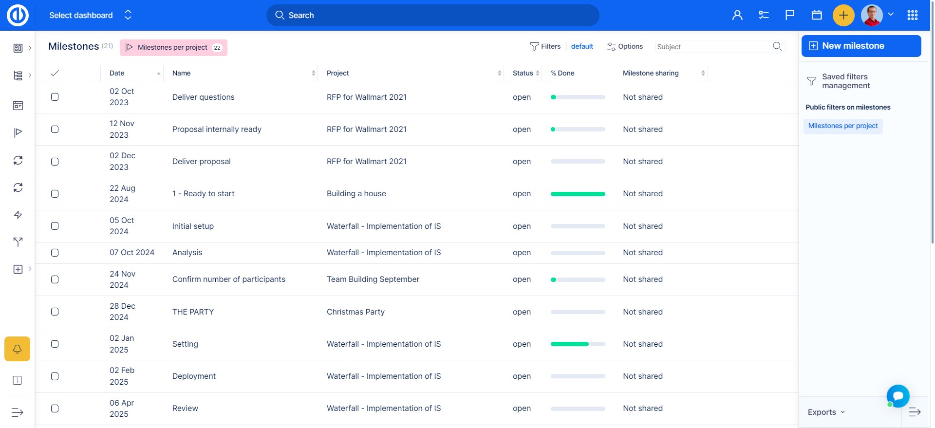 Afterward, you can go to Global menu >> Milestones . Please note that using this list, you can even manage milestones belonging to projects you are not a member of. Use this feature with caution.