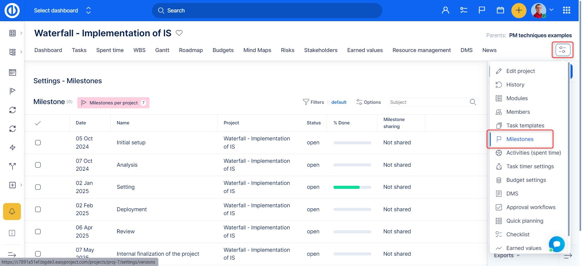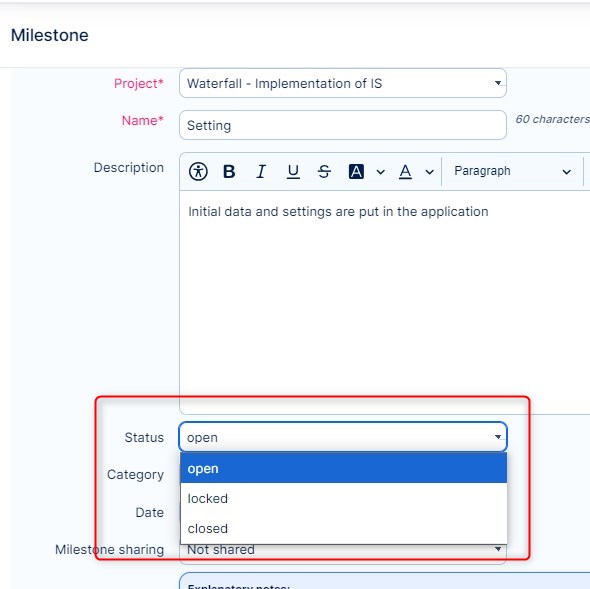 An already created milestone can have one of these 3 statuses, which can be changed anytime in the milestone edit mode: