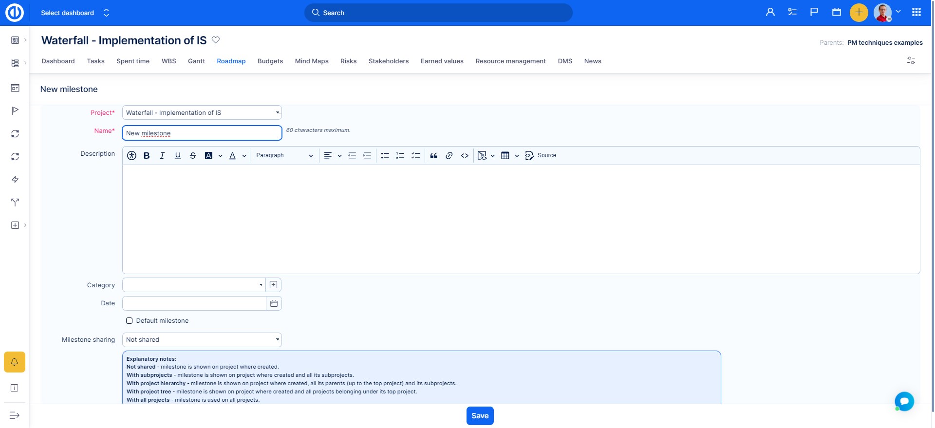 Here you choose the project (when creating it from a project, the project will be preselected). The newly created milestone is automatically assigned the status Open. Add a name, description, category, date of the milestone, and choose the way of sharing: