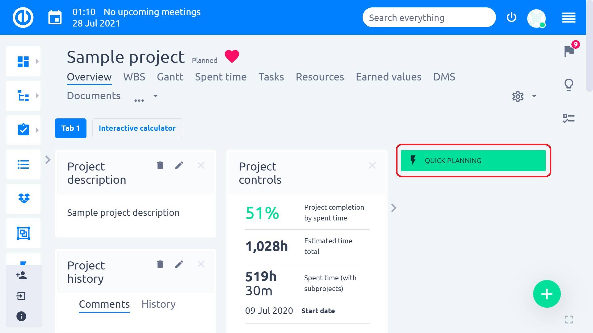 To activate Quick project planning, click on the green button on the right.