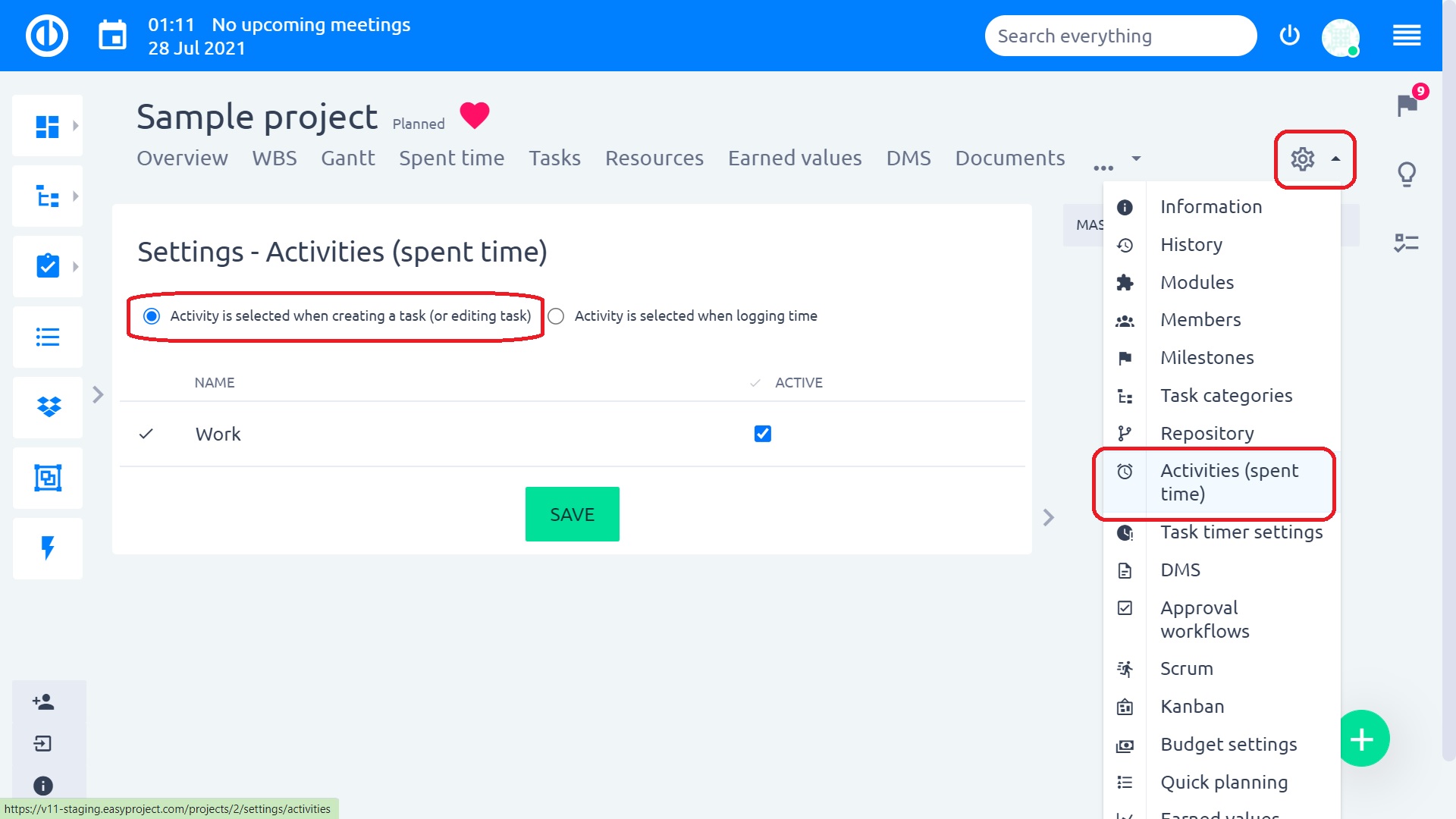 Please note that every time you create a new task, all required custom fields and standard fields must be filled in, even in the Quick Project Planning. If they are not filled in, an error message will show up. Special caution should be taken when there is active option "Activity is pre-selected when creating a task" in project's Settings > Activites (time tracking) as illustrated below. In such a case, the activity field is always required field when creating a new task.