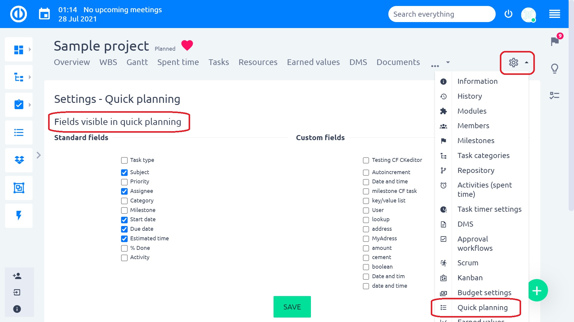 To select which columns are required to fill in when using the Quick planning, navigate to project's Settings > Quick planning > Fields visible in quick planning, where you can choose from both standard fields and custom fields. We recommend selecting just about 3 columns co that the Quick planning actually fulfills its purpose, to remain quick and simple.