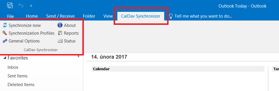 After installing the plugin, a new ribbon called "CalDAV Synchronizer" is added in Outlook with 6 menu items: