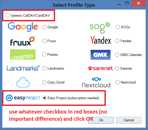 When adding a new profile you can choose between a generic CalDAV/CardDAV, a google profile to simplify the google profile creation and predefined CalDAV/CardDAV profiles for SOGo, Fruux, Posteo, Yandex, GMX, Sarenet and Landmarks, Cozy Cloud, and Nextcloud where the DAV Url for autodiscovery is already entered.