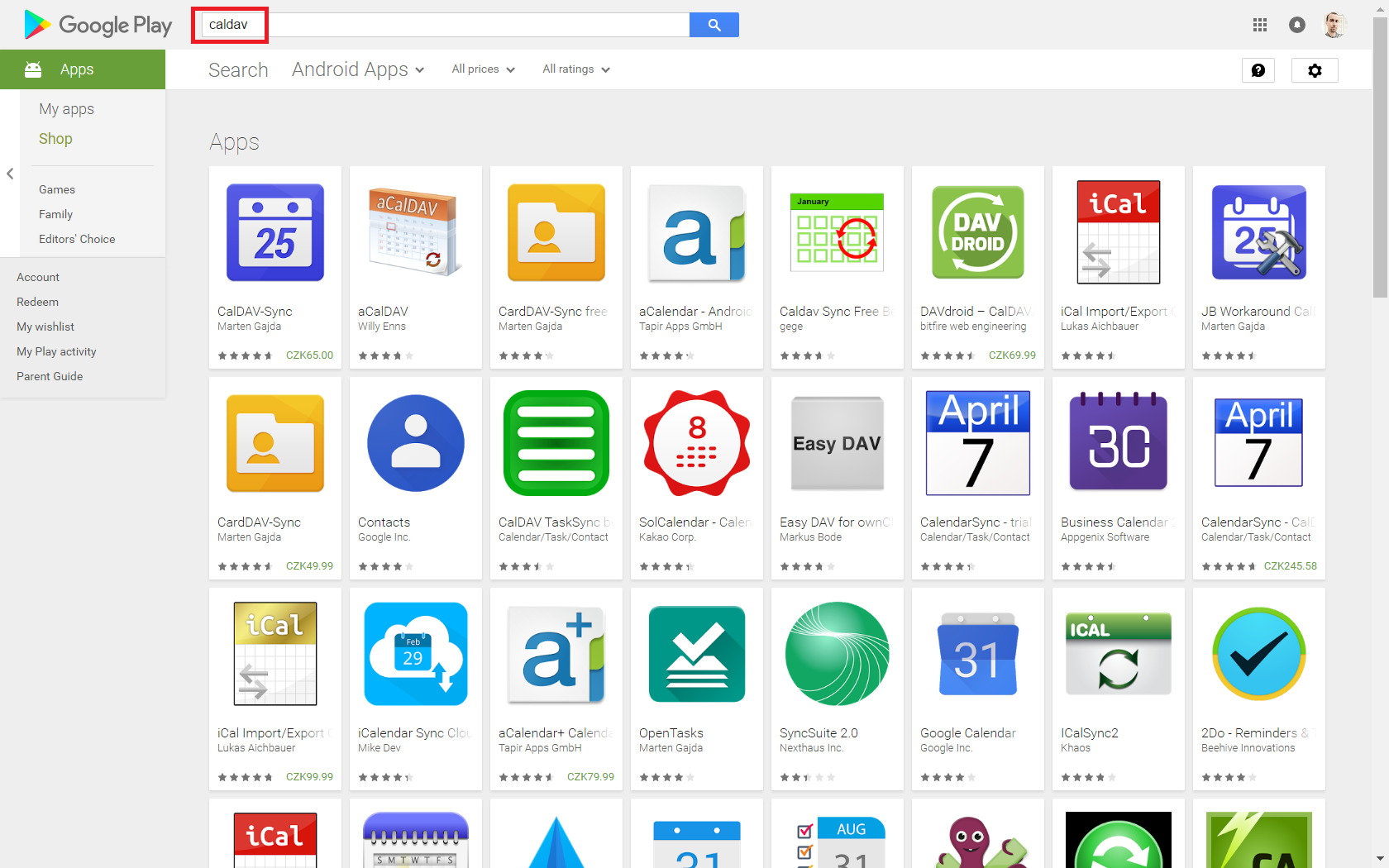 As for Android operating system, CalDAV protocol is not natively supported so you need to install an additional application to synchronize data between Easy8 and your mobile device. You can select from a broad variety of such apps at Google Play online store after entering keyword "CalDAV" into the search box (see below).