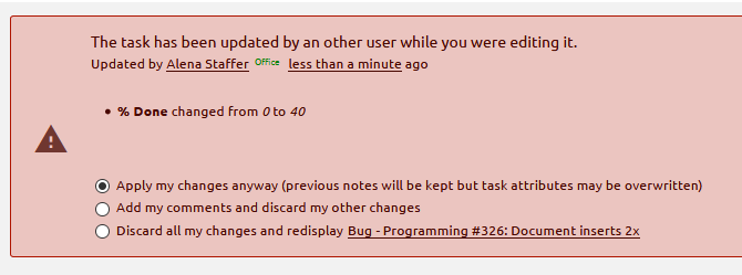 Situation when two users are updating the same task. The second user (who saves the update second) receives a warning about the previous update done by the first user. Attachment uploaded by the second user is not uploaded and a warning informs that you should reupload the attachment.