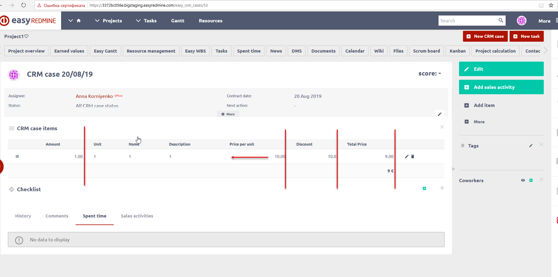 Values alignment was different for each column in the "CRM case items" section after adding an item. We changed the table headings to be aligned accordingly to the content of cells - headings of numerical values such as amount and price were aligned to right.