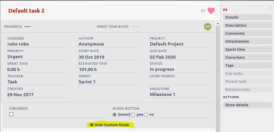 - Boolean - if your boolean custom field has output dropdown, it will be shown as radio buttons in this window