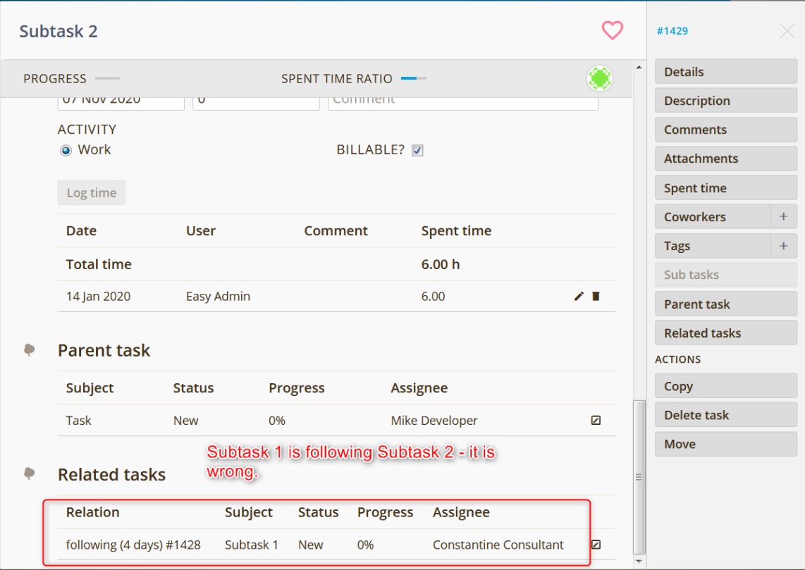 A task relation viewed in the Quick task editor said that Subtask 1 preceded Subtask 2 although the opposite was true.