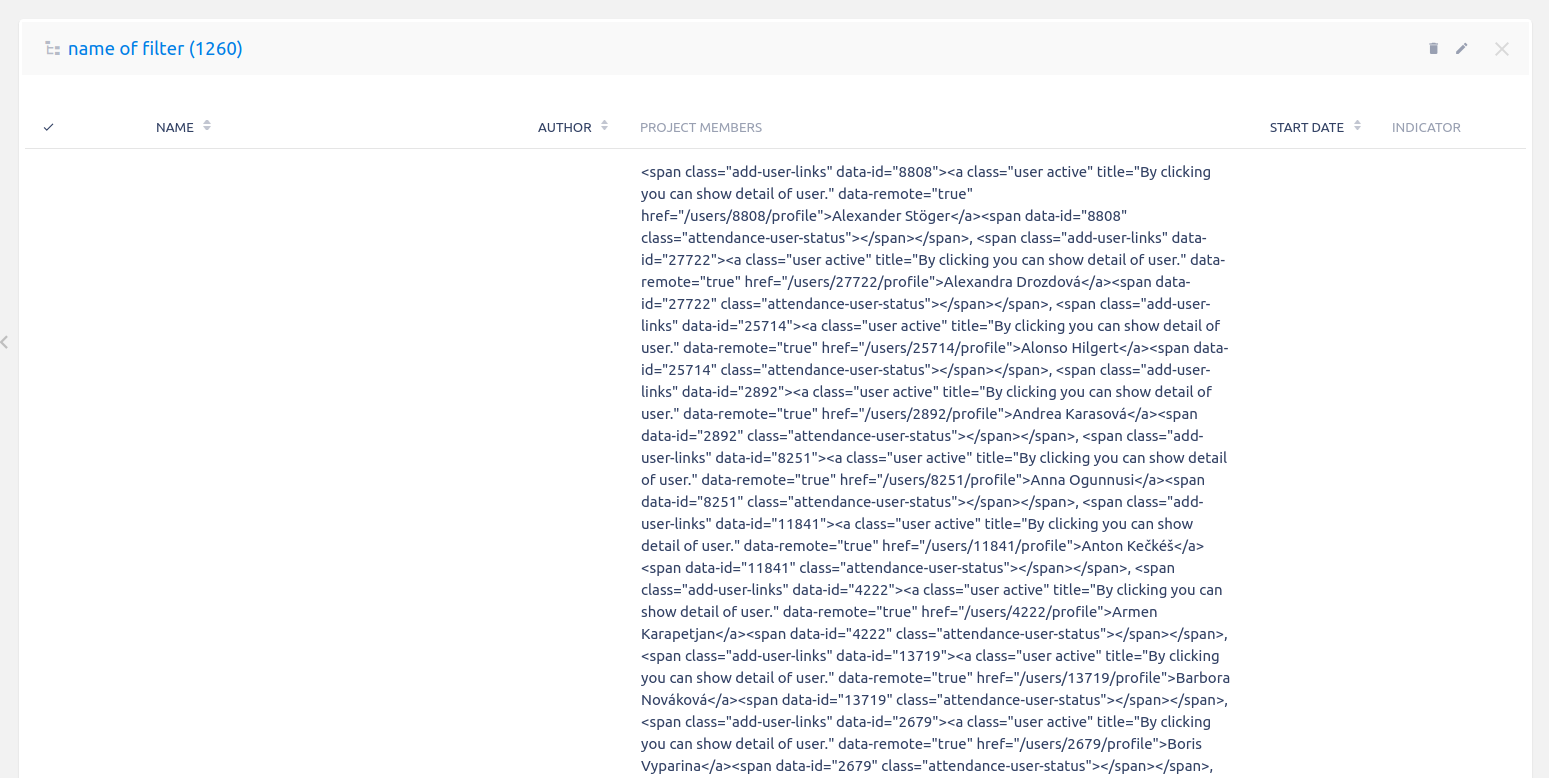 The page module "Projects from filter" shows the column "Project members" wrong, displaying the code instead of names.