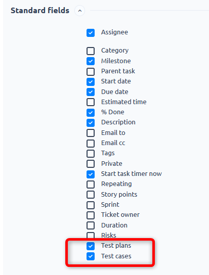 - Test cases, Test plans - are visible on task if the module Test cases is enabled on project AND if the fields are enabled on the tracker