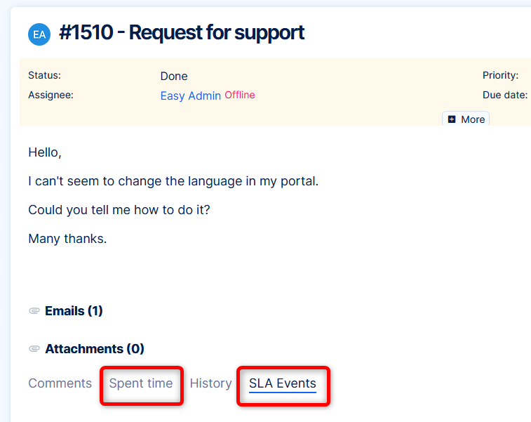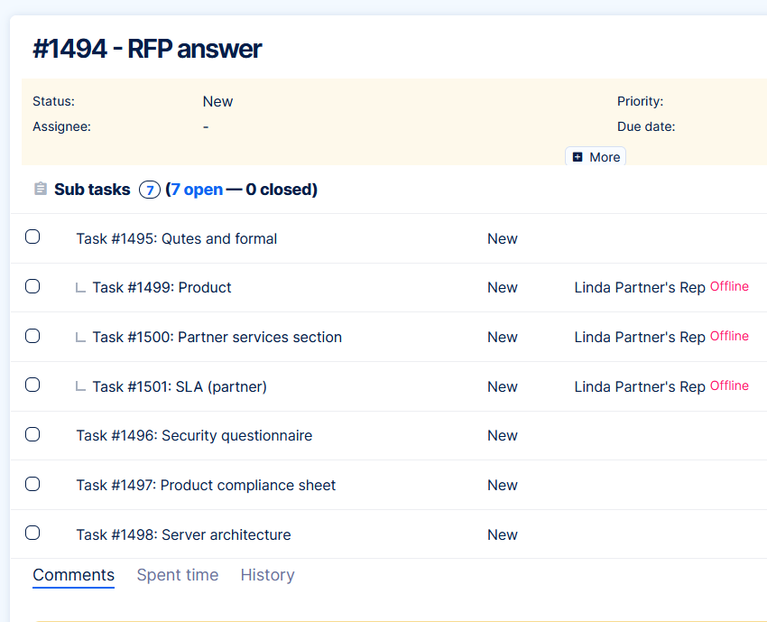 Tabs on task detail - Spent time and SLA events are now only shown if the user has proper permissions. Previously they were shown even if user had no permissions for them, and showed "No data" within.