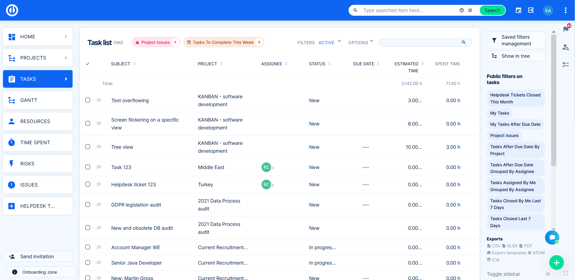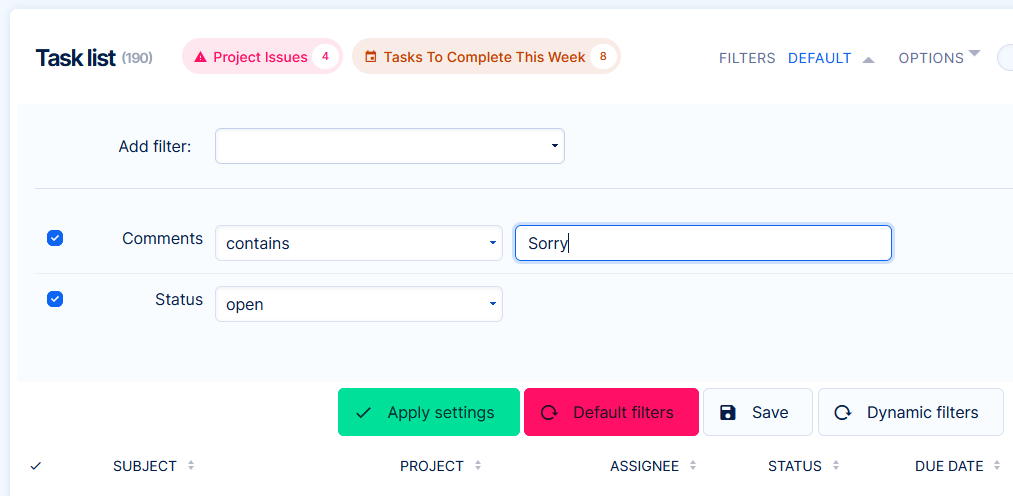 Just please be aware, that in big databases this filter may be really slow, since it is a regular database request. If you are just looking for a specific task, we recommend using the fulltext search, which searches instantly.