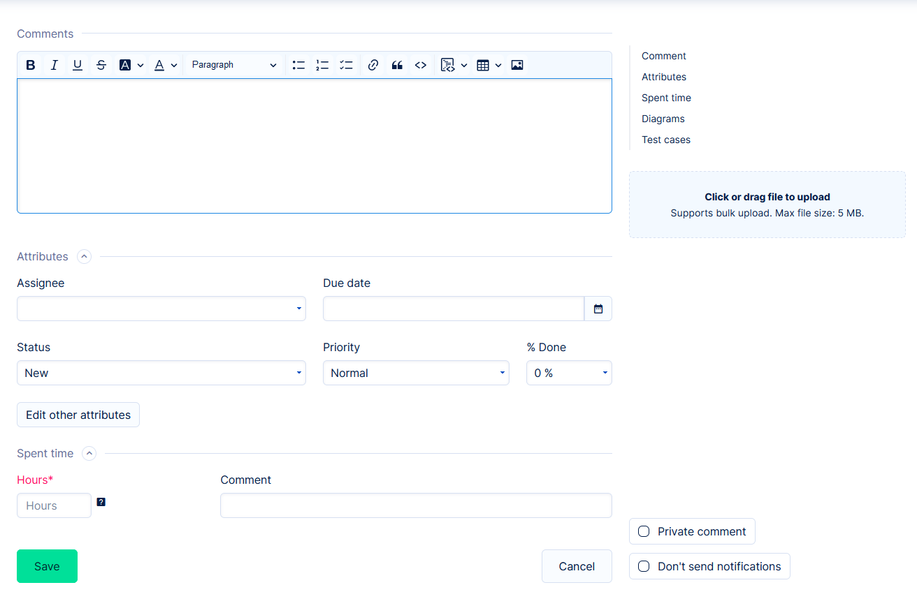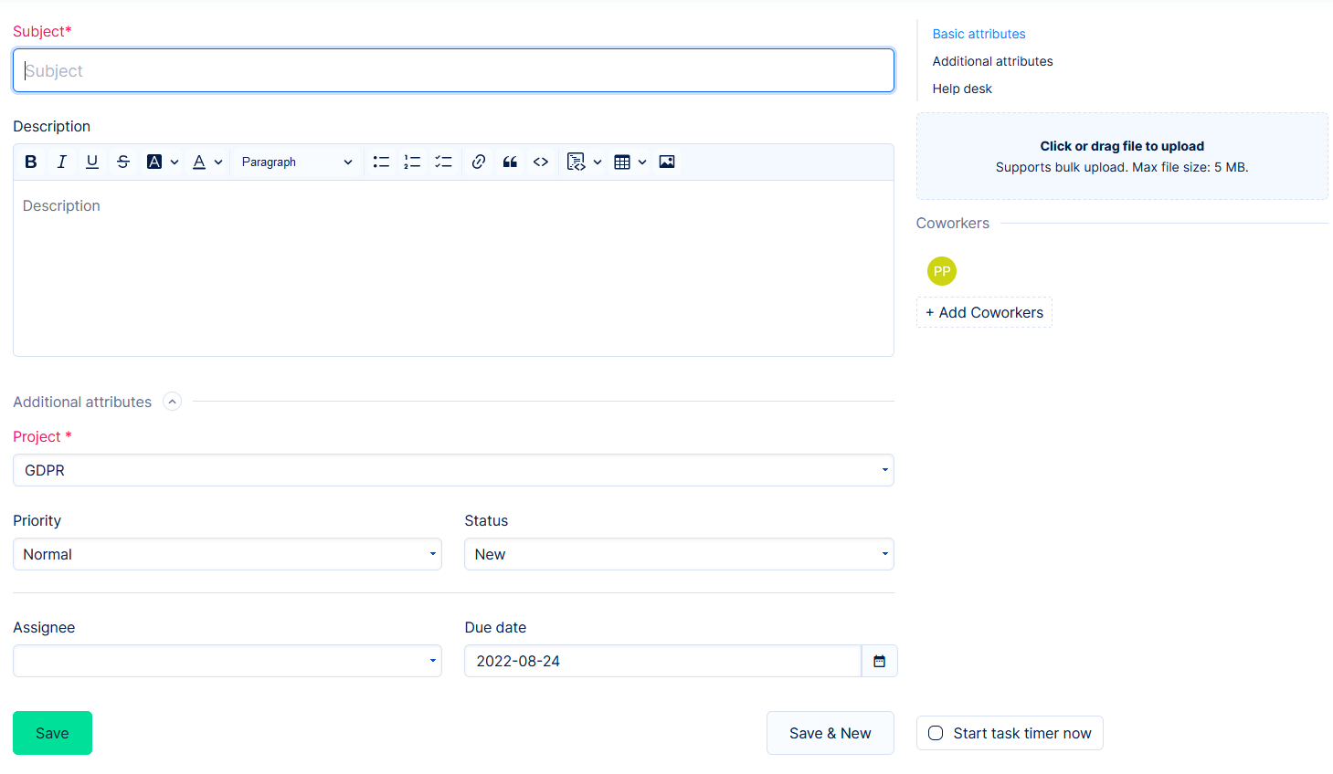 The fields are now in one main vertical sleeve and ordered according to their importance. Under Subject, Description and Project, come Priority, Assignee and Due date, the crucial native attributes accompanied by Status, which may vary from default in case of more advanced workflow.