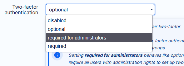 Not only admins may have access to important data. It is also possible for enforce two factor authentication for members of certain groups. That makes perfect sense, because membership in groups in fact determines memberships (roles) in projects.