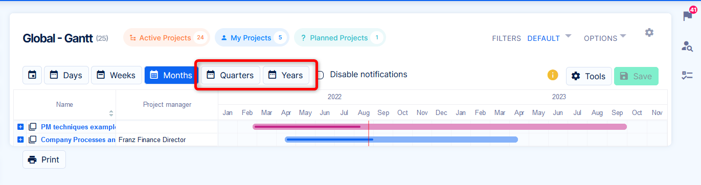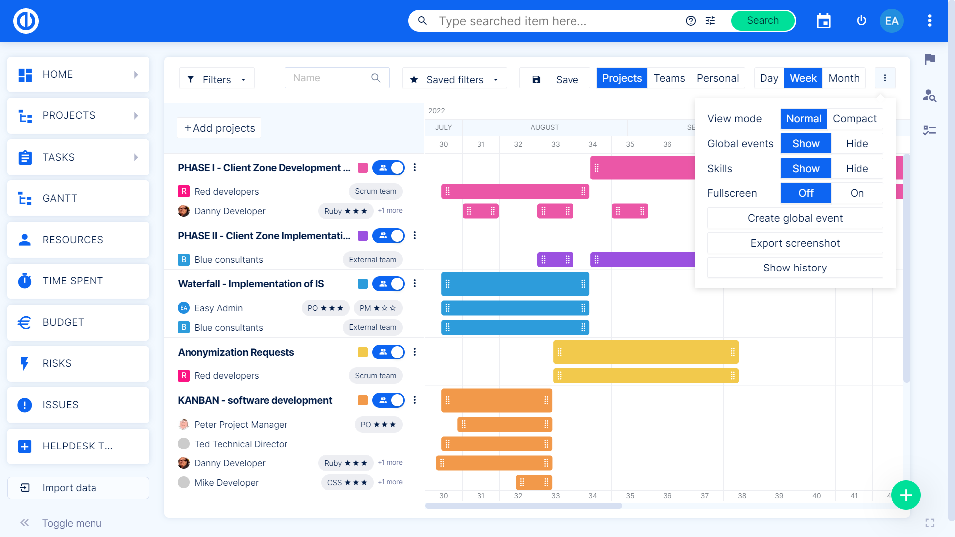 Zoom out perspective in Gantt and Resource management. Both views are based on ISO calendar.
