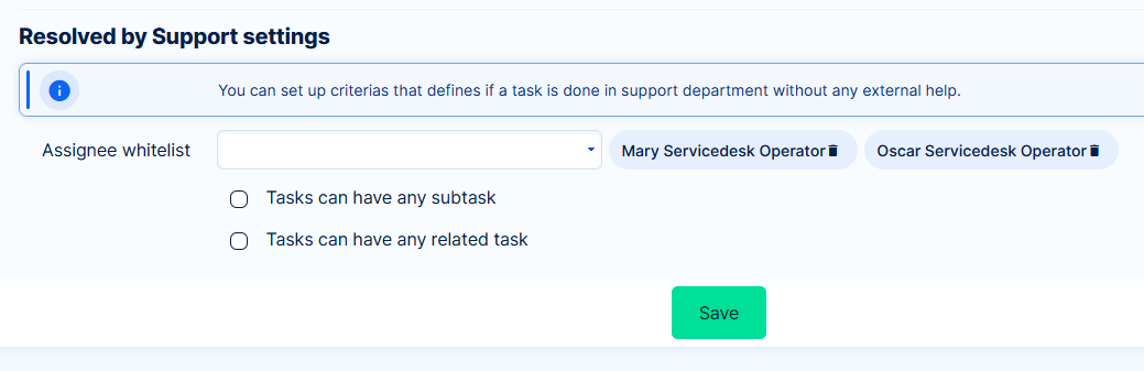 - Settings for subtasks/related tasks will determine whether tickets resolved by support can or cannot contain subtasks or related tasks