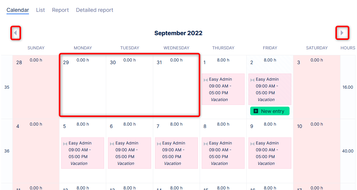 - The filter is reset to 1-31 day of the month => The calendar shows only entries in that calendar month. Items in the last week of previous month and first week of the next month are “missing”
