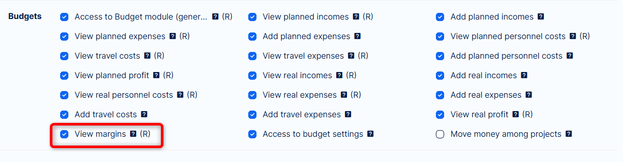 Profit margin and Net margin are tied to new permission called View margins in the Budgets section. With this permission + related permission Access budget module user is able to see the net margin. To view profit margin user also requires permissions View real incomes and expenses.