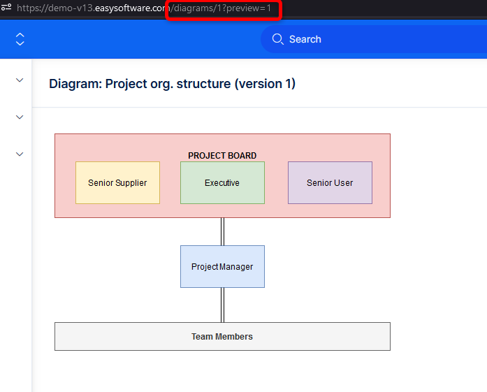 There is a new page to Show diagram which makes it easier share Diagram link and the user opening it will be directed to the diagram view, instead of edit (e.g. https://demo-v13.easysoftware.com/diagrams/1?preview=1 )