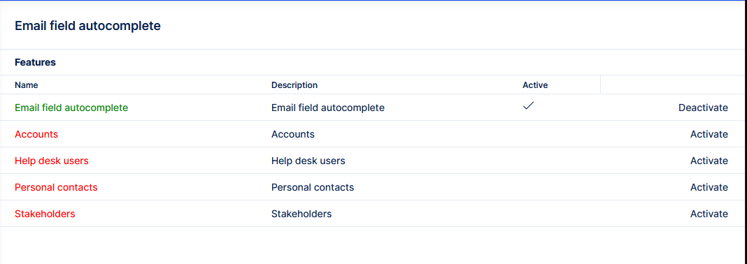 This feature is disabled by default. To enable it, go to Administration >> Plugins >> Email field autocomplete - Edit and activate feature Email field autocomplete and needed data resources.