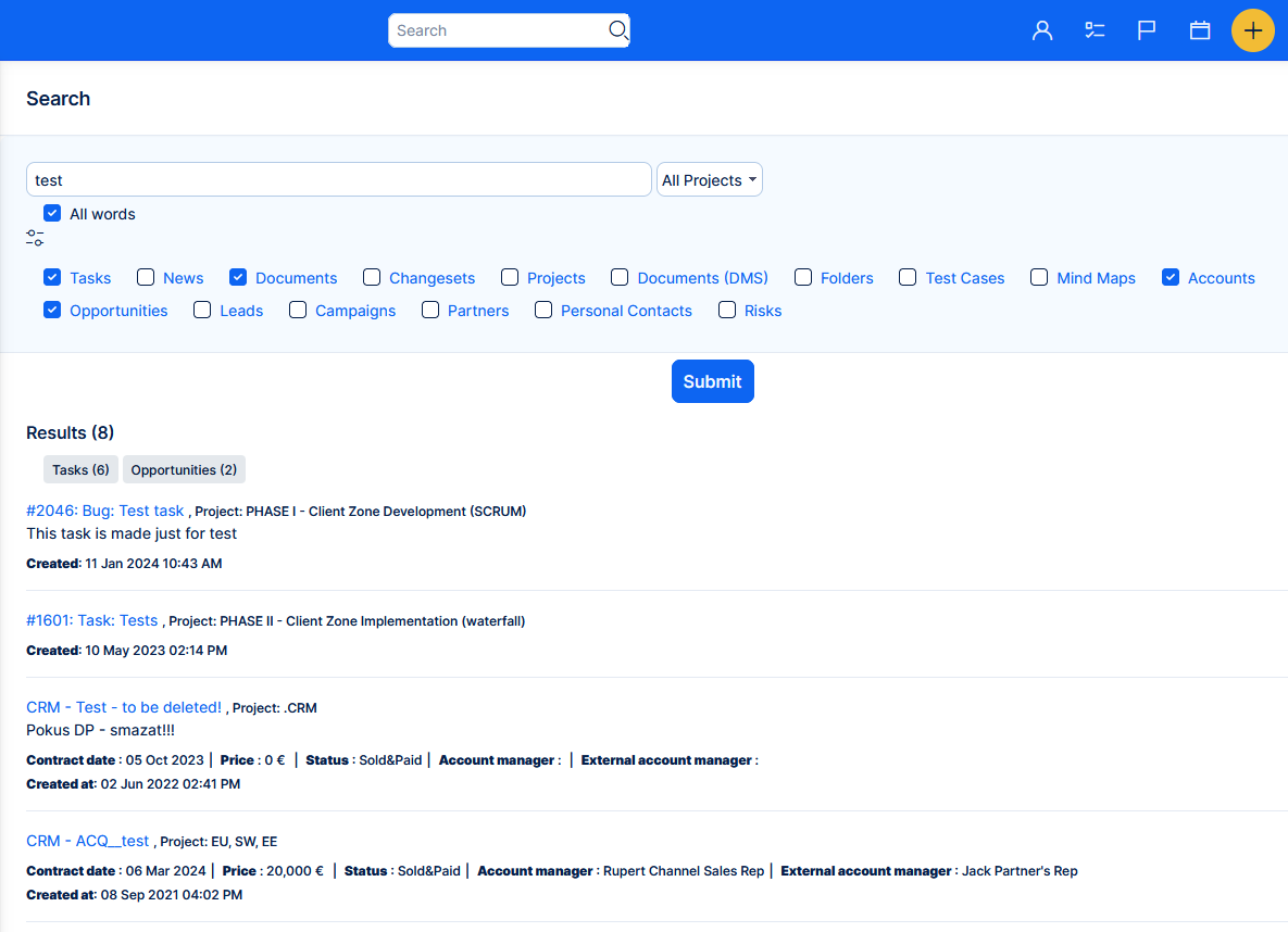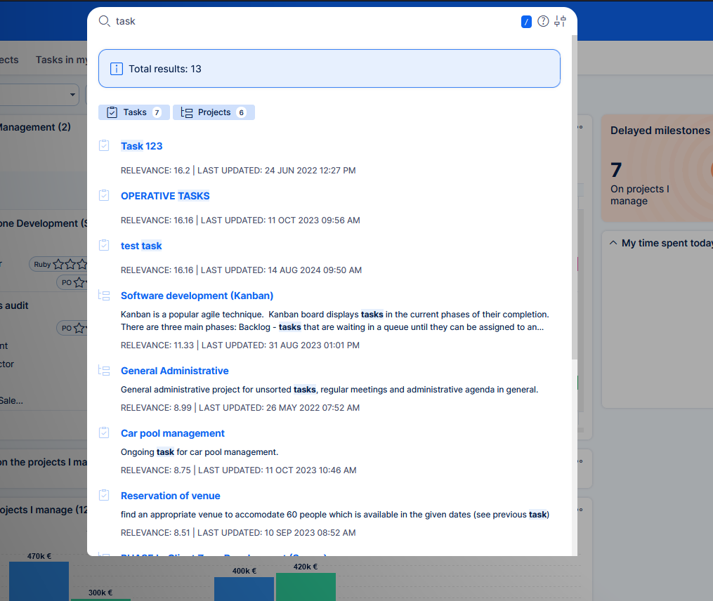 - Speed - the legacy search was very sensitive to data volume. When search included closed tasks, it realistically could take more than a minute. The new search was tested with millions of entities (and some very long task history) and the results are always delivered within 2 seconds