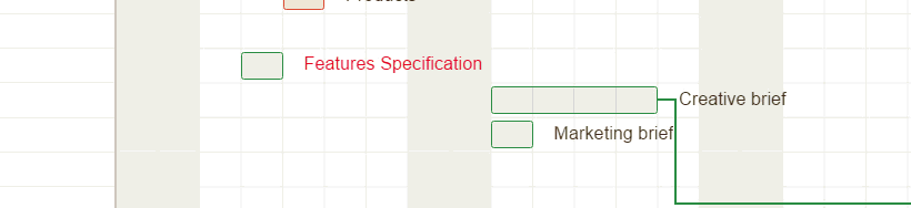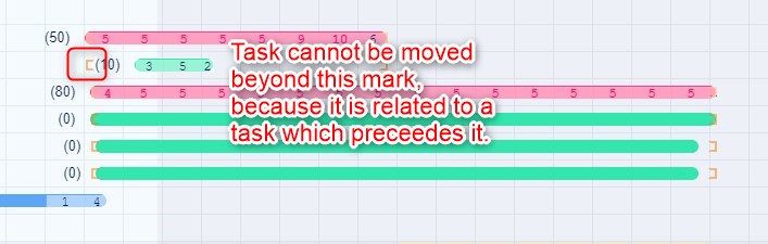 Show soonest start: Show lowest valid dates for tasks defined by relations or parent. As illustrated below, the square bracket indicates the lowest date you can move the task to, but not any further because it's related to another task that precedes it.