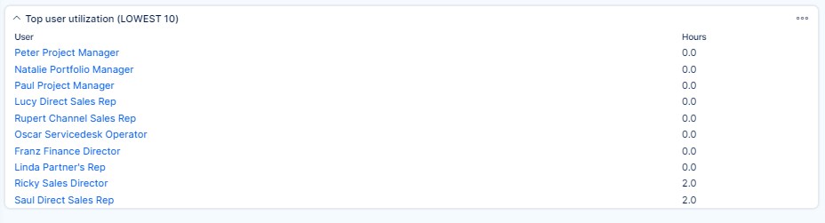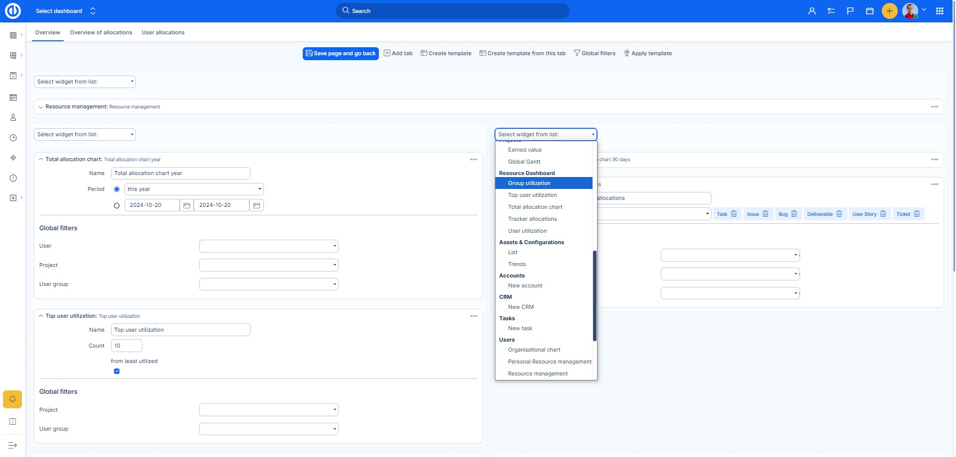 You can add either global or personal level Resource management as a widget on your Dashboard. To do it, click on "Customise" button in the lower left corner and select the particular widget from the list. Then customize your filters of the widget and save it.