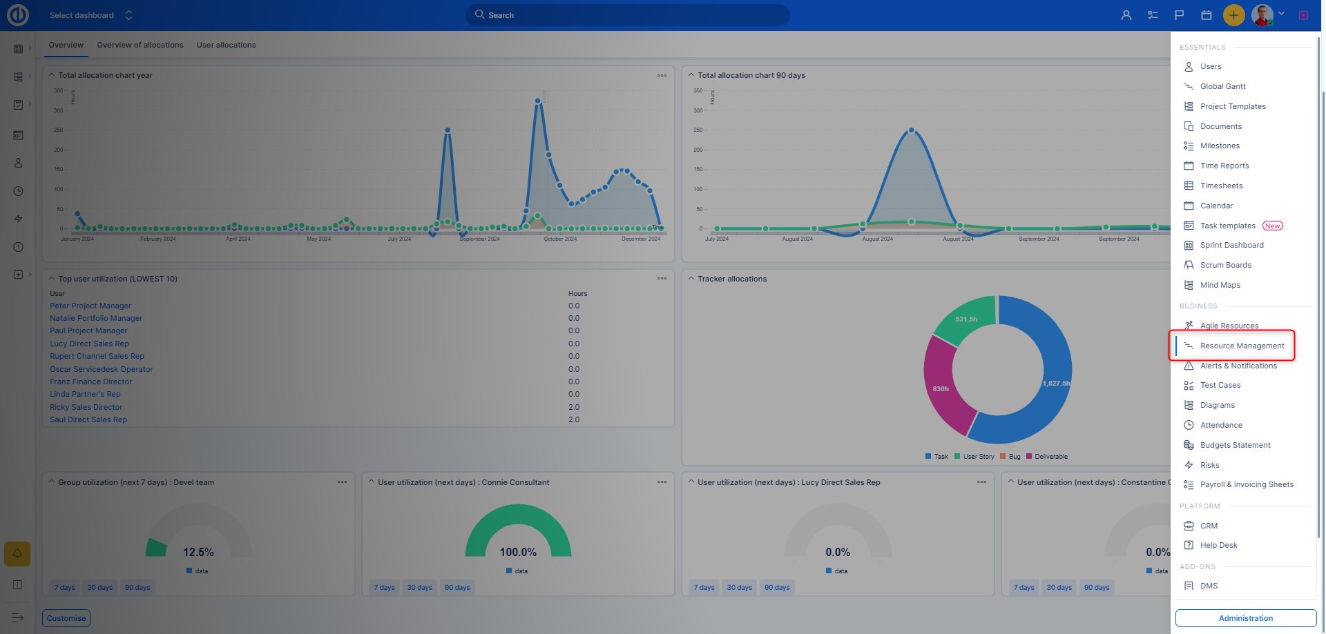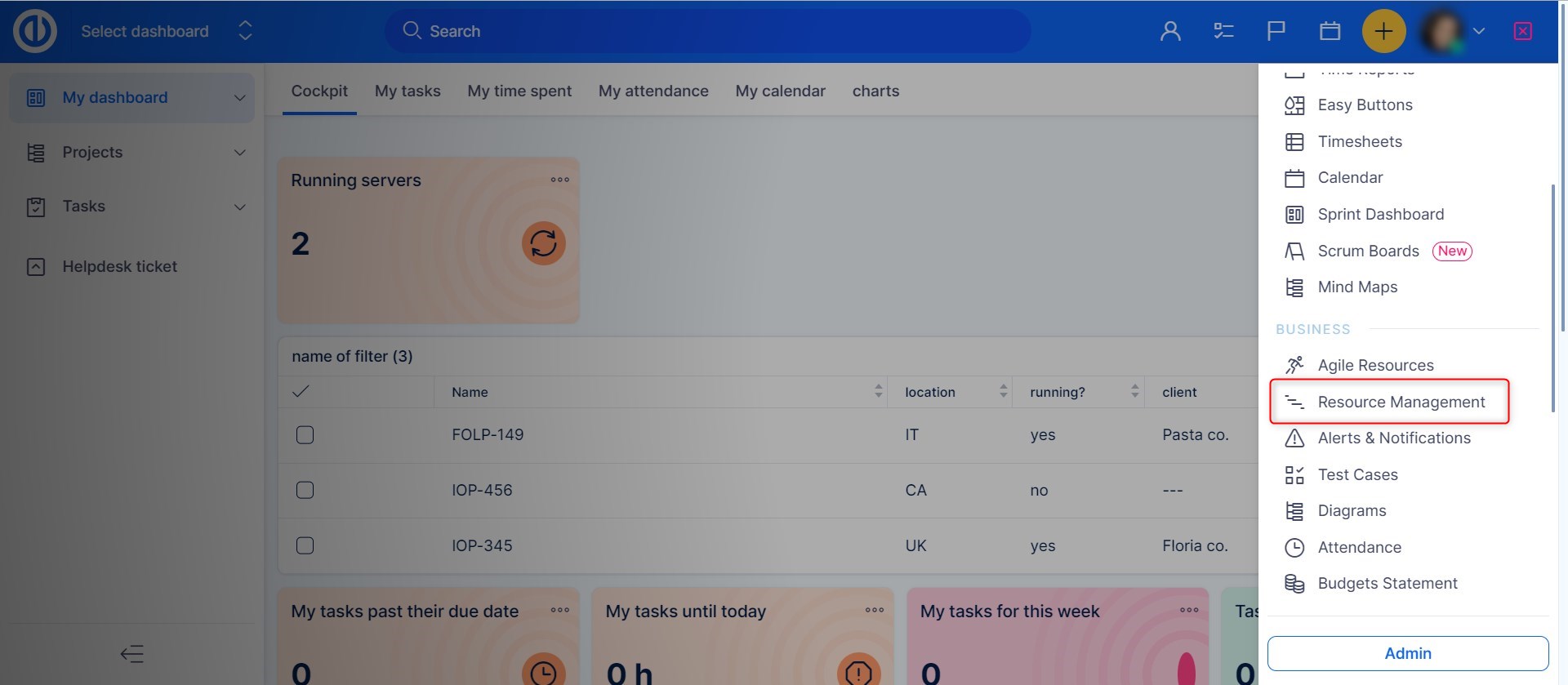 Resource management is available both on the global level and the project level. To access it from the global level, go to Global menu >> Resource management or type "/easy_resource_dashboard" after your Easy8 domain address.