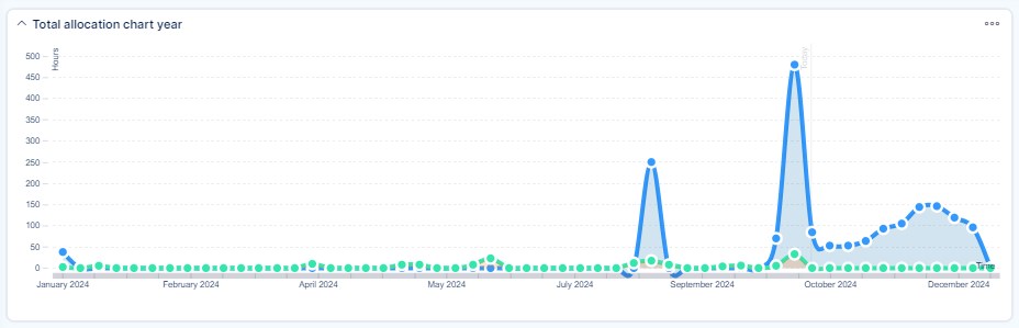 Total allocation chart shows a total allocation overview as the proportion of spent time and estimated time per all resources in a single chart. This may look like this.