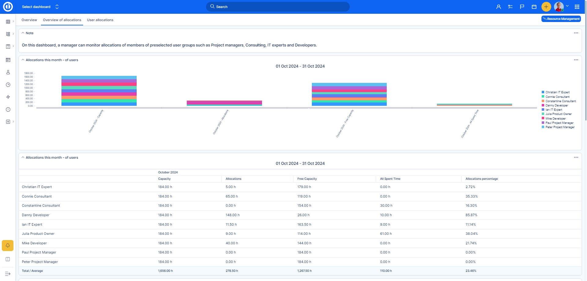 Resource Dashboard is a complement to the Resource management plugin. It is a set of dashboards that brings an ultimate visual overview of all your resources on a one-page dashboard. So you need no more than just one look at this dashboard in order to get an instant insight into your KPI's and resources.