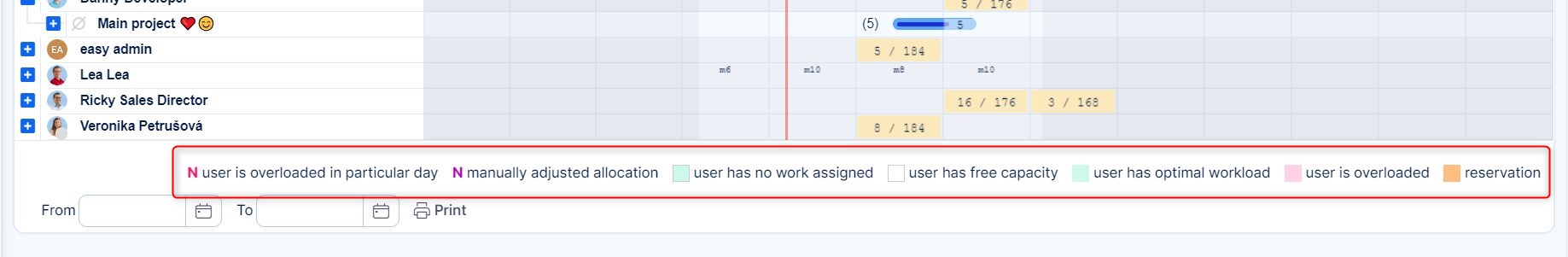 When you are on a week/month view, you can see a sort of resource allocation summary per each user in the respective period. The colors indicate the level of workload as described on the image below. After switching the view to weekly/monthly basis, all workload allocations are evenly spread over the respective period.