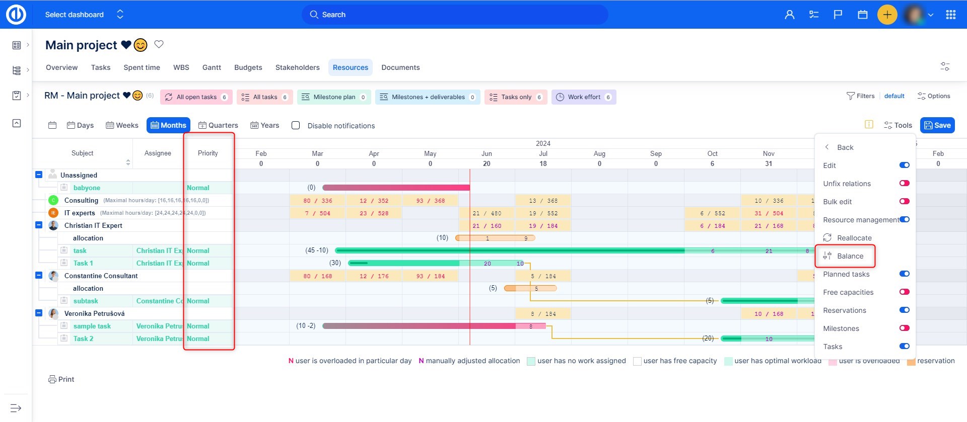 The balancing process is always executed in order of tasks' priorities - if the Priority column is displayed on the left side of Resource Management, tasks with a higher priority are balanced first (before tasks with lower priority). If the Priority column is not displayed, then tasks are balanced according to their order in the left-side list. Reservations are excluded from balancing. Reservations are allocated evenly by default, which can be changed when creating a reservation.