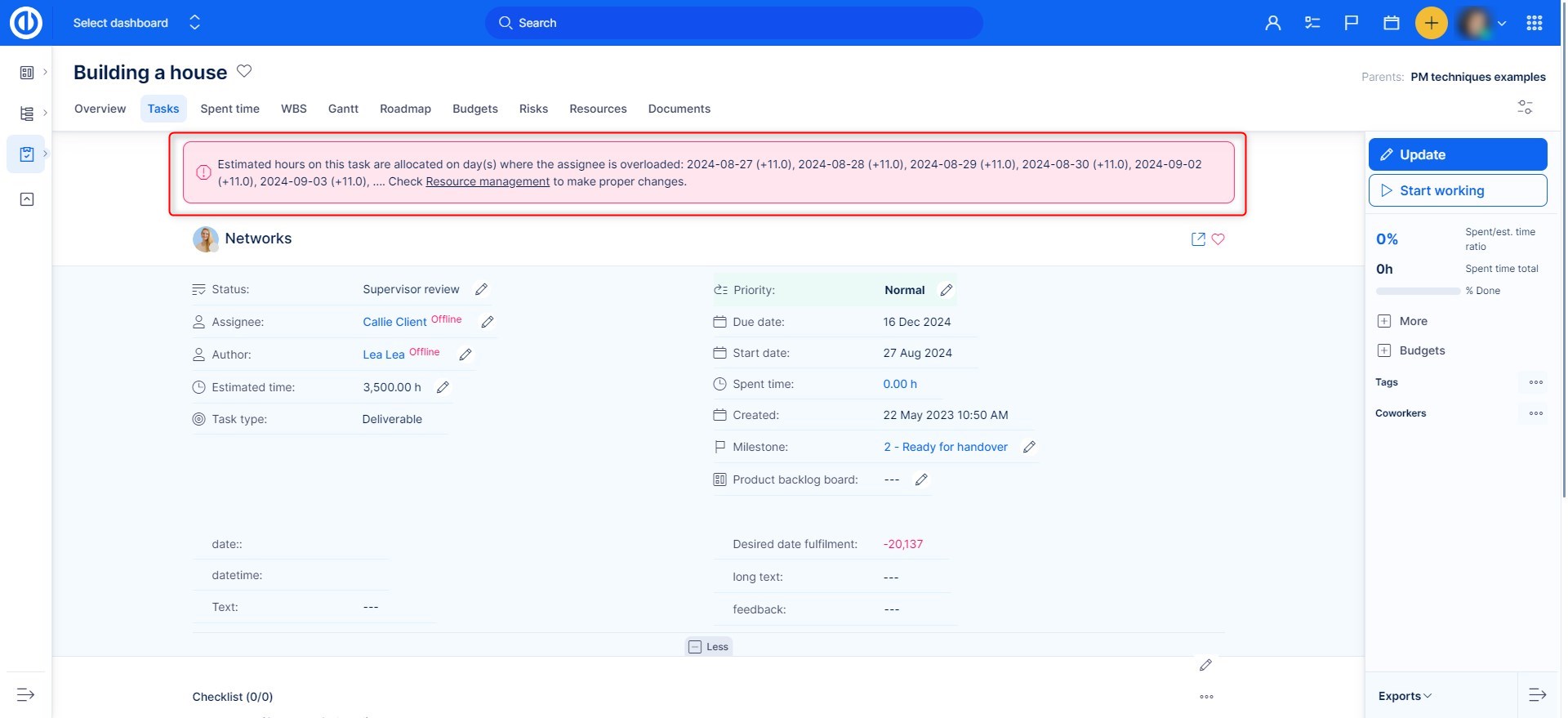 Watchdog: Watch assigned user overloading during task creation and editing, i.e. when a task has too many estimated hours related to a user's allocation capacity, a warning alert shows up in the full-screen task detail after creating or editing a task as illustrated below. The feature doesn't work when a task is unassigned, assigned to a group or anonymous user. Also, it doesn't show any alert when you are not on a task detail, for example, when assigning a task using the drag-n-drop feature in Resource management.