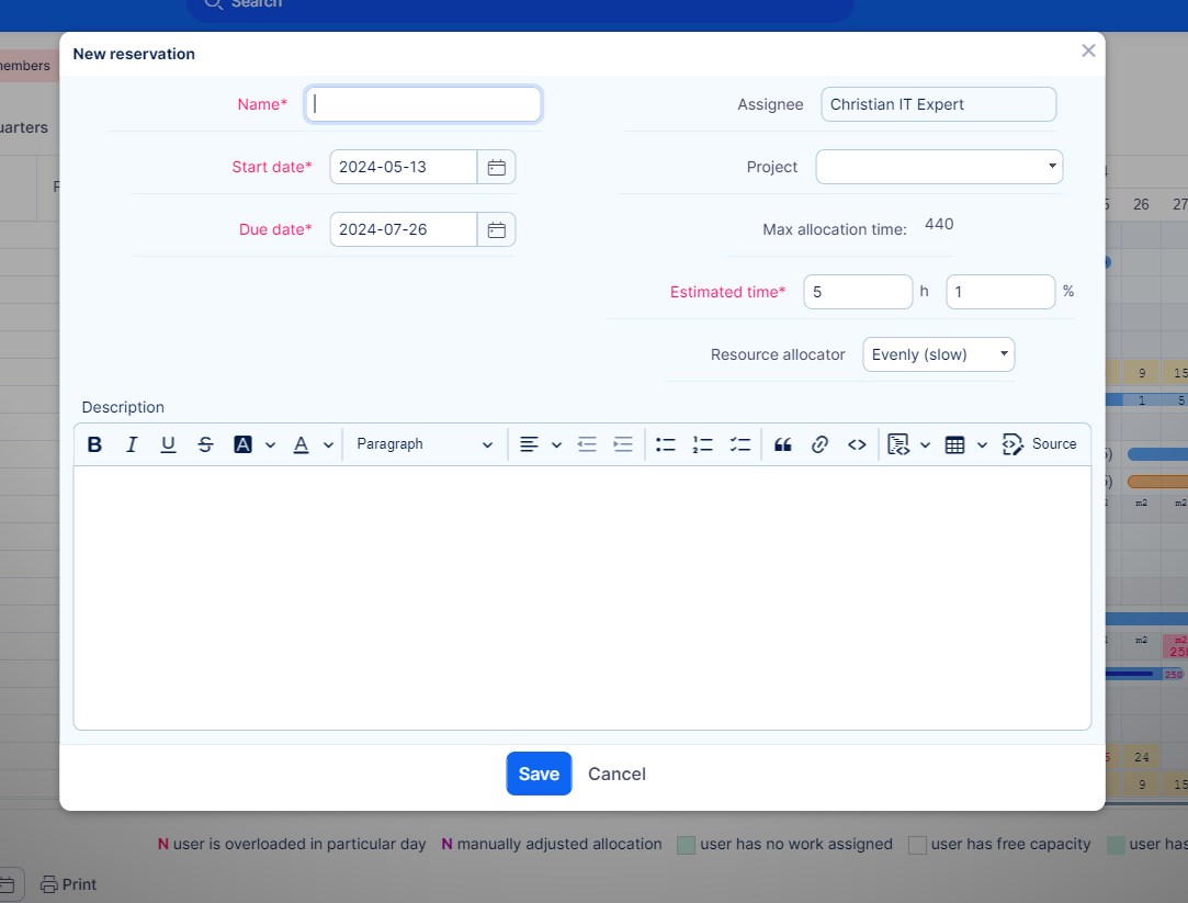 The Reservations feature enables managers to allocate specific workers to particular projects based on estimated working hours. This functionality is especially useful when managers are aware of the general project assignments but are uncertain about the specific tasks workers will undertake.