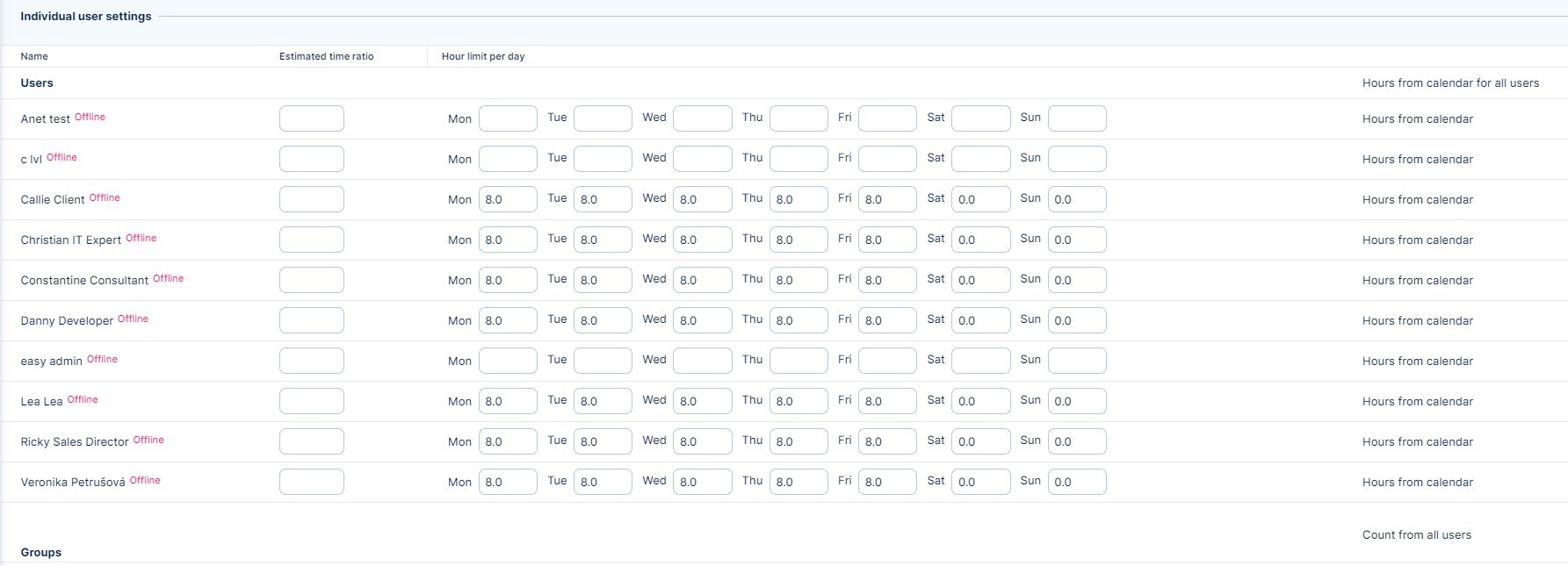 - Here you can set both "Estimated time ratio" and "Hour limit per day" for entire groups. The values can be entered either manually or let it count automatically from group members. If no values are set for individual users, they are evenly distributed among group members. If values are set both for users and groups, the group's settings take into account user's settings and thus distribute the values accordingly among group members.