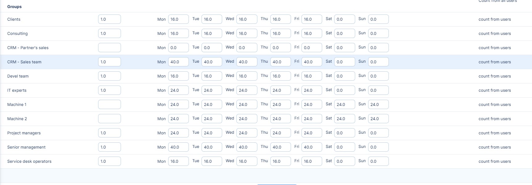 - Advance hours definition: With this option enabled, you can set the "Hours per day" limits for each day of week separately.