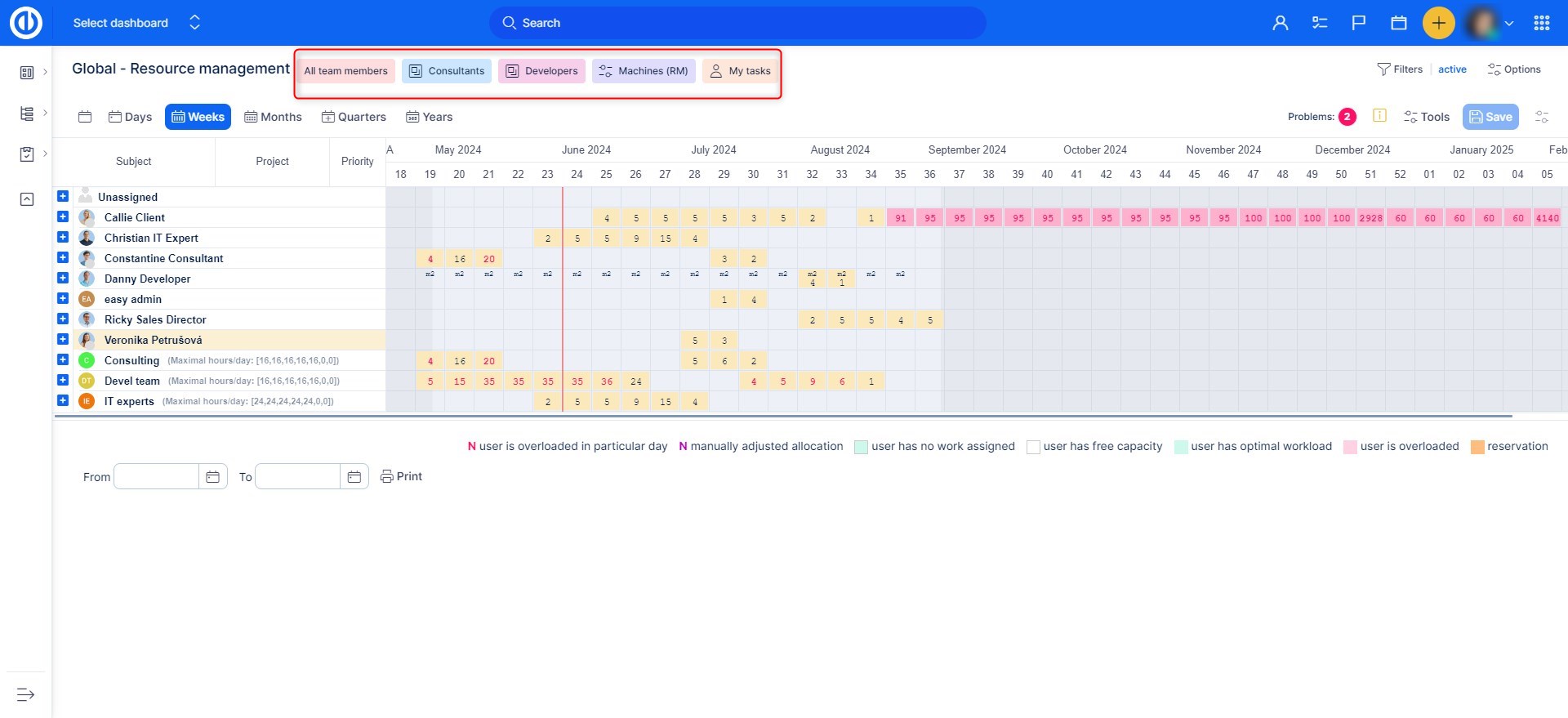 Competence planning allows you to reduce your view to the resources (users) you actually need to work with. To do it, set up and save filters by tracker and user and then make them visible in the heading like on the animation below. If you don't know how to set up the filters, check out this tutorial. Resource management supports all standard filtering options already well-known from any kinds of lists in Easy8. This way you can show only certain tasks or users according to your preferences. Resource management offers two groups of filters - for tasks and for users.
