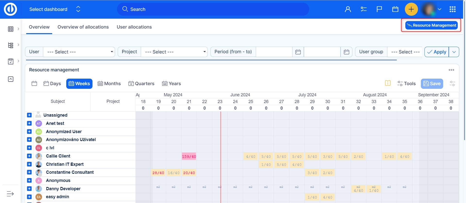 Immediately after activating the module, the Resource management tab will appear in the top menu of the particular project. Click on it and Resource management will open. Using the functionality on the project level is a better choice for the users who need to manage resources of the particular project only so there is no need to see them for all the projects as on the global level. Another difference is that Resource management on the project level is integrated with Easy Gantt so you can effectively work with both the modules together which is not possible on the global level. If you open a parent project in Resource management, only the selected project is displayed, not its subprojects and their tasks.